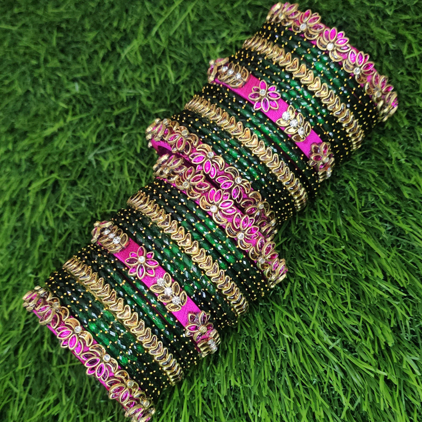 Beautiful handcrafted bangles designed in rich combination of gold, dark green and Rani pink. Each bangles is adorned with intricate detailing, lotus motifs and fine Kundan work.